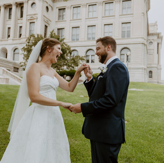 After getting ready, the couple made their way to Central High School for portraits. While not a typical wedding location, Central High’s exterior is a photographer’s dream — grand stairs, clean lines, and striking architecture that photographs beautifully. This stop gave Kaitlin and Adam the perfect blend of modern sophistication and urban charm, just minutes from their reception venue.